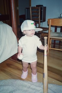 But she adored her big brother. He was her beau ideale. She tried to do everything he did. One day after a long session of father-son baseball during a family vacation, we were all back in our hotel room sprawling on the floor, when Sidney came in from the adjoining bedroom, baseball cap askew on her head, ball the size of a grapefruit in her right baby hand, bat in the other hand, toddling over to us as if to say, “Play baseball with me!” It was one of those rare moments that shines in all our memories.
